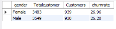 SELECT GENDER, COUNT(*) AS TOTALCUSTOMER, SUM(CHURN) AS CUSTOMERS, CAST(SUM(CHURN) * 1.0 / COUNT(*) *100 AS DECIMAL (10,2)) AS CHURNRATE FROM CHURNDATA GROUP BY GENDER ORDER BY CHURNRATE DESC;