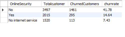 SELECT ONLINESECURITY, COUNT(*) AS TOTALCUSTOMER, SUM(CHURN) AS CHURNEDCUSTOMERS, CAST(SUM(CHURN) * 1.0 / COUNT(*) *100 AS DECIMAL (10,2)) AS CHURNRATE FROM CHURNDATA GROUP BY ONLINESECURITY ORDER BY CHURNRATE DESC;