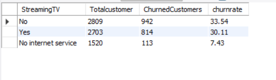 SELECT STREAMINGTV, COUNT(*) AS TOTALCUSTOMER, SUM(CHURN) AS CHURNEDCUSTOMERS, CAST(SUM(CHURN) * 1.0 / COUNT(*) *100 AS DECIMAL (10,2)) AS CHURNRATE FROM CHURNDATA GROUP BY STREAMINGTV ORDER BY CHURNRATE DESC;