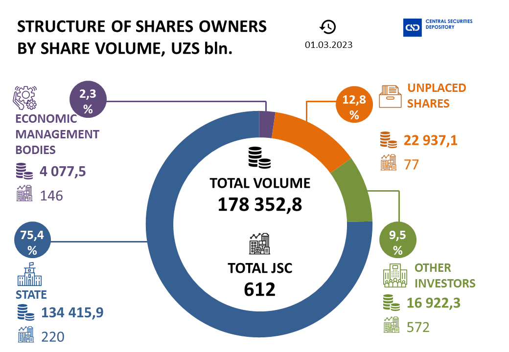 The total volume of shares issues increased by UZS 11 487.4 billion and amounted to UZS 178 352.8 billion. Among the changes in total volume there also was the primary shares issue of JSC “Navoi kon-metallurgiya kombinati” for UZS 15.0 trillion.