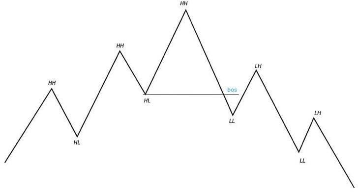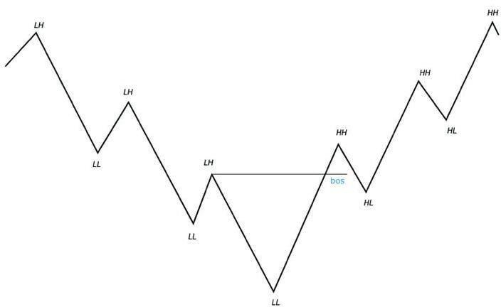 Бос или же слом структуры это смена строение рынка или же как говорят смена тренда с нисходящего на восходящий или же наоборот с восходящего на нисходящий