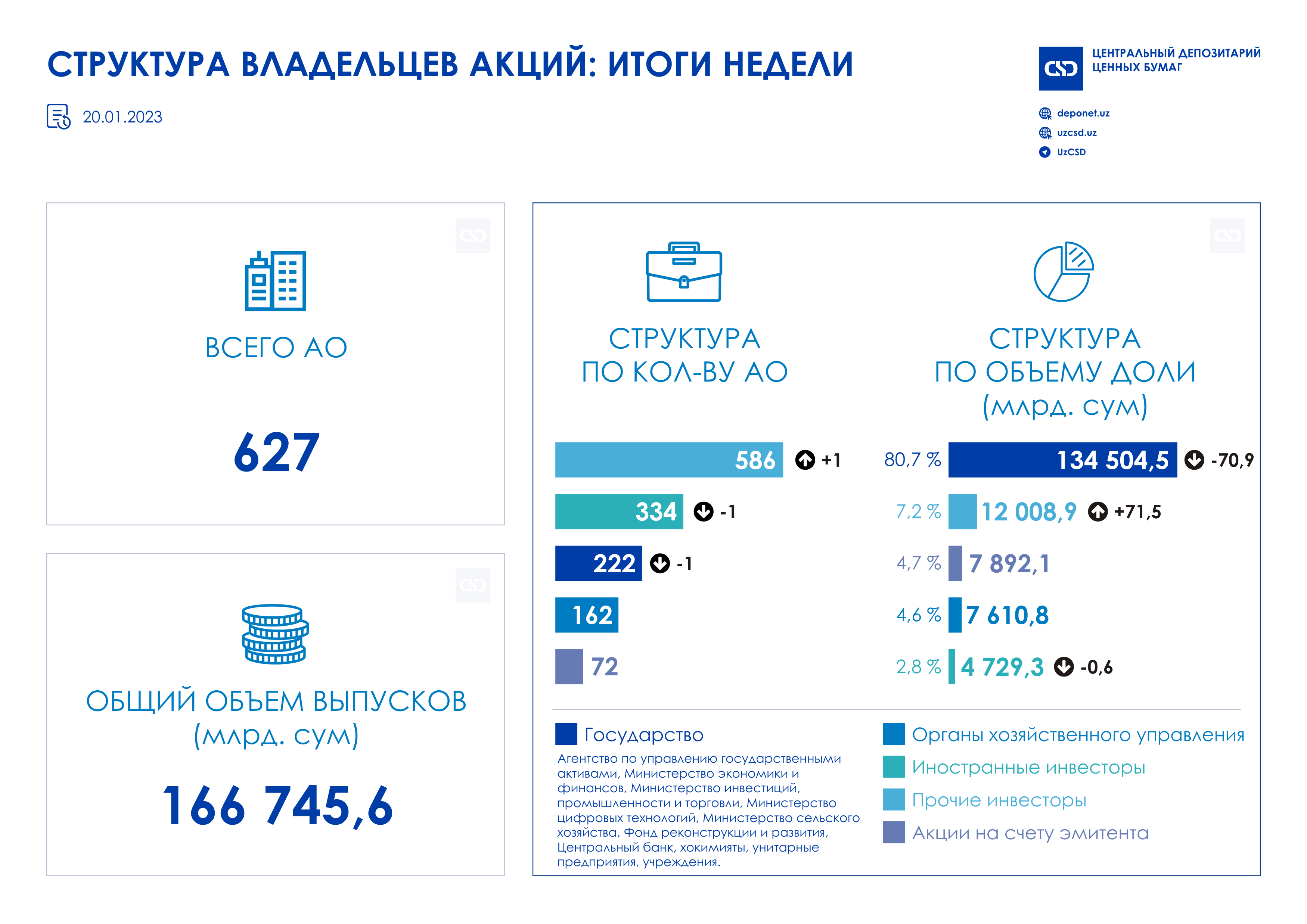 По состоянию на 20.01.2023 г. количество АО составило 627. Общий объем выпусков акций составил 166 745,6 млрд. сум.