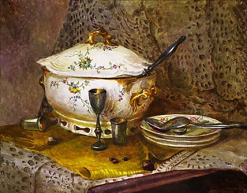 Может быть, помните, в каждом столовом сервизе в 60-70 г.г. была супница. У нас был чешский сервиз на 12 персон, с желтыми такими тонкими цветами и зелеными с золотом листьями. Родители поженились в 66-ом и сразу купили его. Да, и вот супница в том чешском сервизе тоже, разумеется, была.