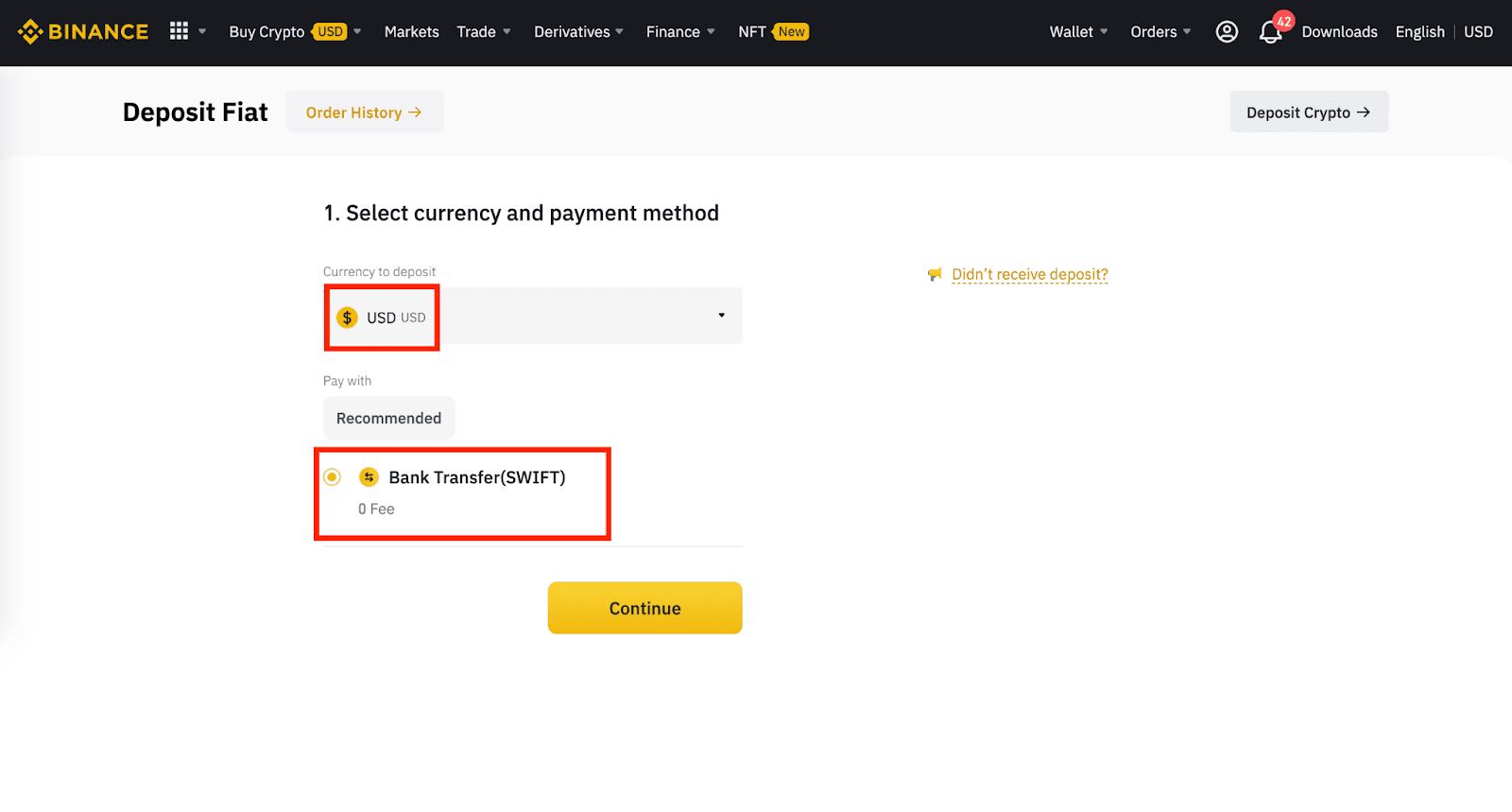 ⦁ Укажите валюту «USD», после — «Банковский перевод (SWIFT)»