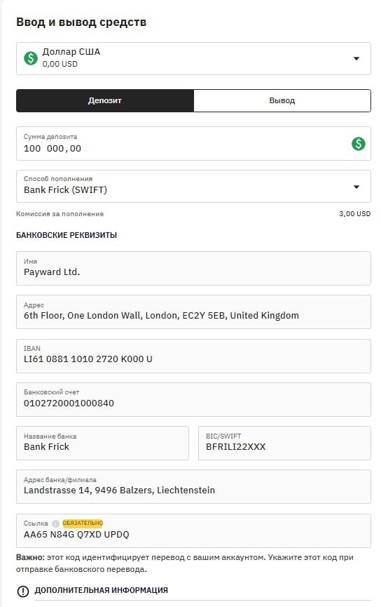 Выбираем доступную валюту под SWIFT. и далее пишем сумму депозита. Ровно по этой сумме отправлять не обязательно. Он принимает любой платеж по этим реквизитам и зачисляет на аккаунт.