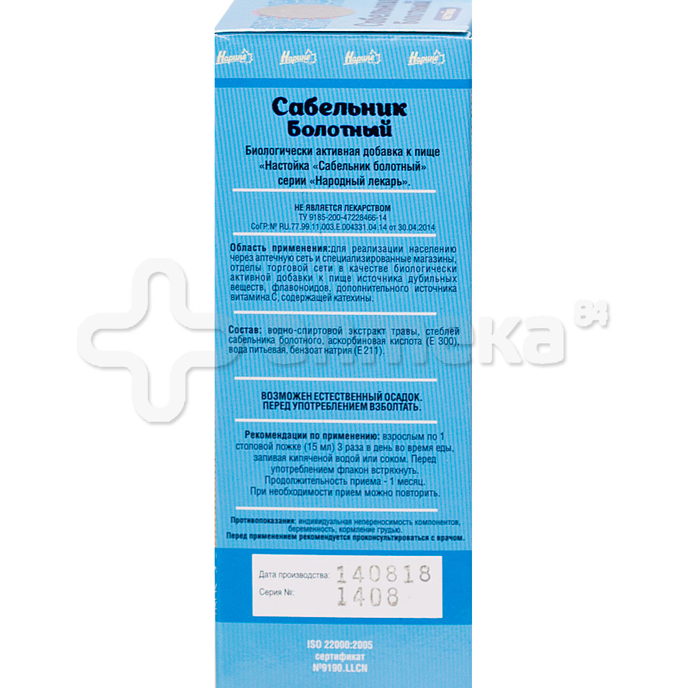 Срок годности препарата Настойка «Сабельник болотный» Серии «Народный лекарь» Состав Водно-спиртовой экстракт травы и корней сабельника болотного, вода питьевая . Показания к применению Рекомендована в качестве биологически активной добавки к пище - источника дубильных веществ, содержащей флавоноиды . Форма выпуска