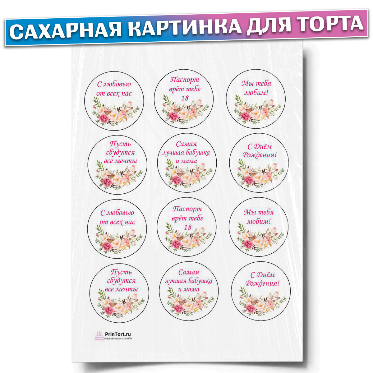 Картинка для печати на капкейках . 290 ₽ . Сравнить . Количество: Купить в один клик . Описание . Описание . Печать на сахарной бумаге удобна тем, что можно реализовать на ней можно любые идеи для оформления торта . Купюры, мультяшные герои, надписи и фотографии .