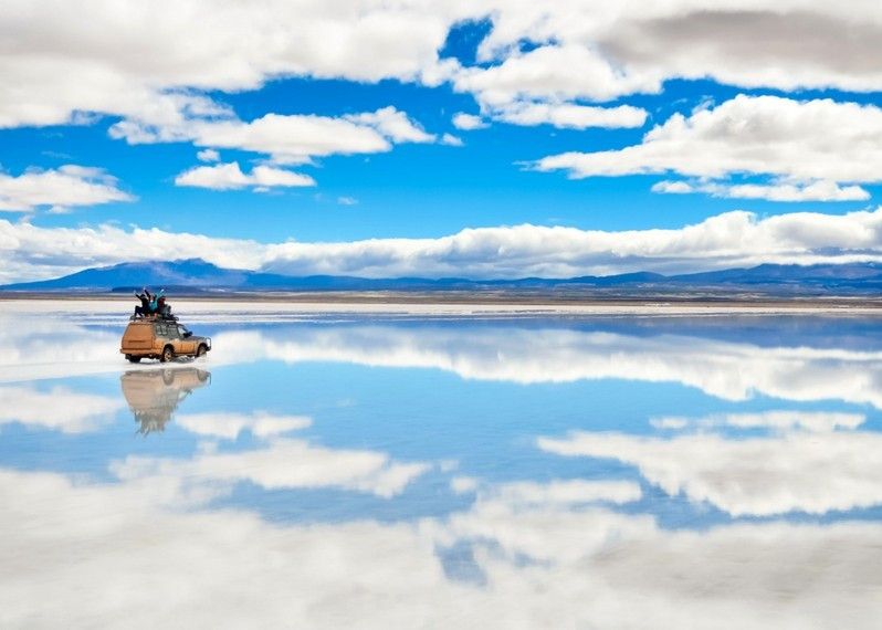 Салар, или солончак Уюни, — самое большое в мире соляное озеро . Добраться до него непросто: надо прилететь в неофициальную столицу Боливии Ла-Пас , оттуда на поезде доехать до маленького городка Уюни и там взять джип-тур по озеру на день или 3—4 дня .