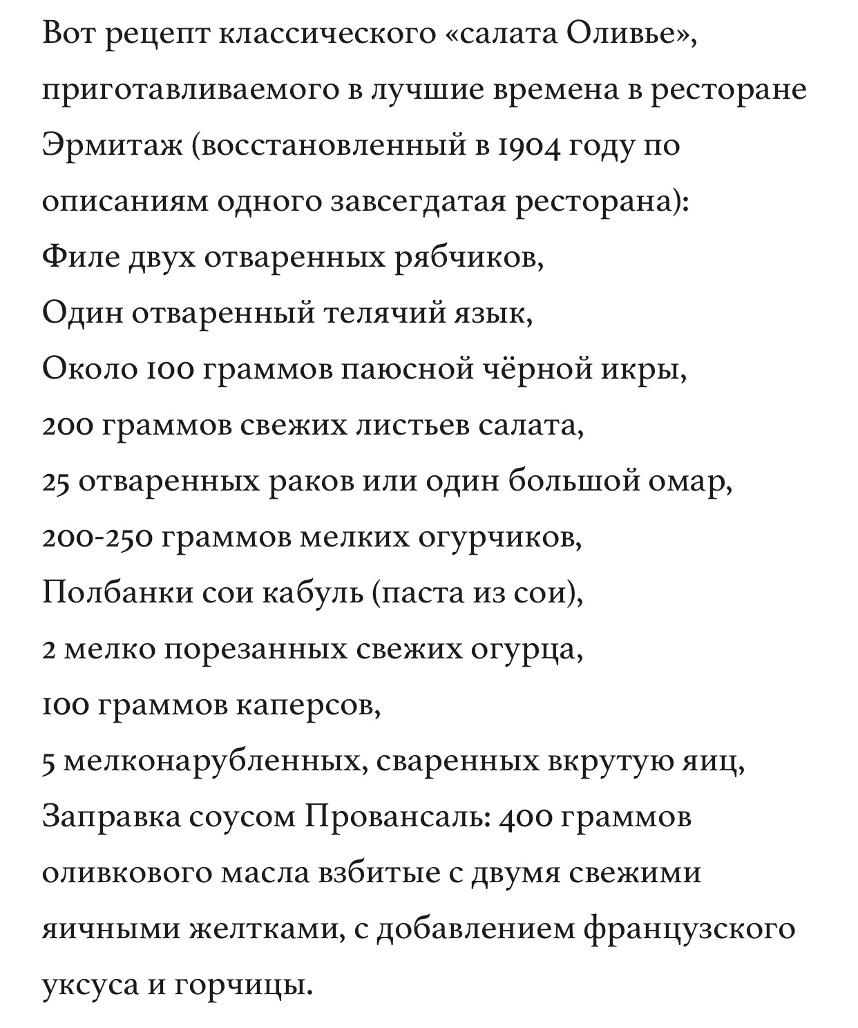 Кулинарный шедевр состоял из филе рябчиков да куропаток, под слоями желе из бульона, а так же паюсной чёрной икры. Блюдо окаймляли варёные раковые шейки и маленькие слайсы языка. В центре для красоты была пирамидка из варёного картофеля с корнишонами и вареными в крутую яйцами. Всё это дело приправлялось фирменным майонезом Провансаль, который Люсьен готовил лично в отдельной комнате, запертой на ключ. Естественно, что рецепт майонеза знал только он.