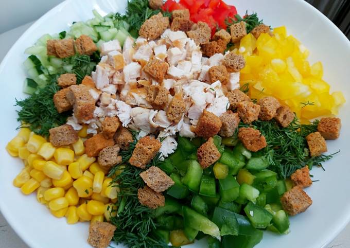 Салат «Радуга» с кириешками или другими сухариками . Сытный овощной салат с сухариками «Кириешки» - палочка-ыручалочка на случай неожиданного прихода гостей или просто желания разнообразить вечер необычным ужином .
