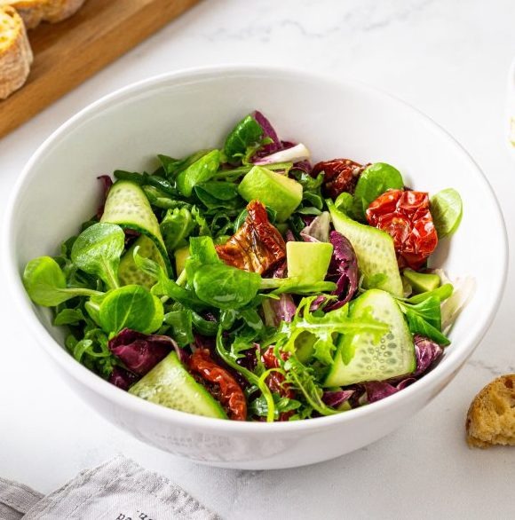 - Переложите зелень с авокадо и вялеными томатами в миску для подачи. Добавьте слайсы огурцов. Сверху полейте заправкой.