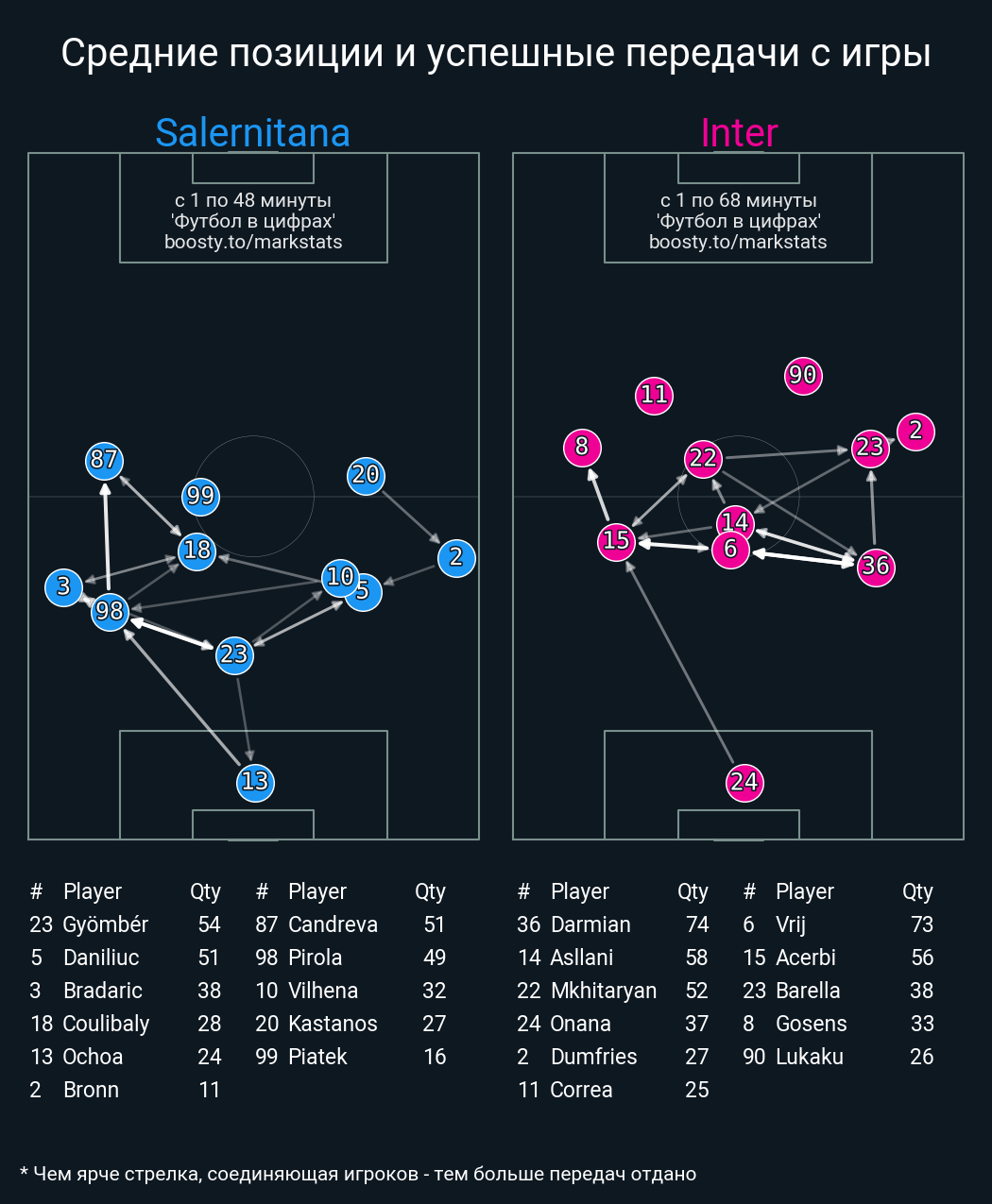 64 успешных передач из 73 попыток (5 с продвижением, )