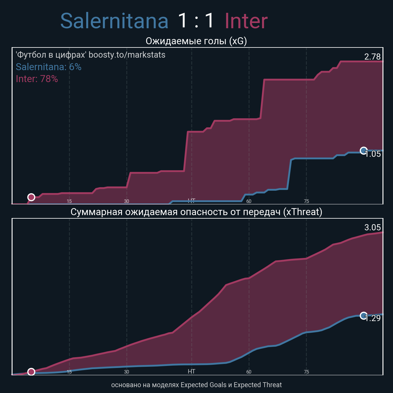 Ожидаемые голы (NPxG): 1.05 - 2.78
