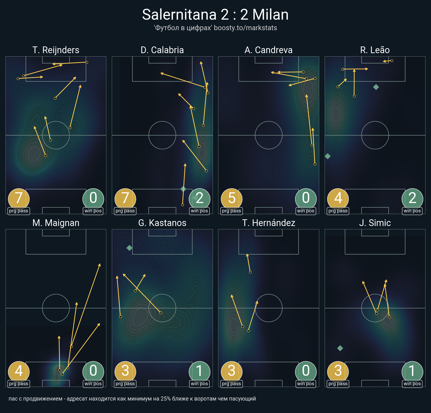 34 успешных передач из 44 попыток (1 ассист, 6 под удар, 5 с продвижением, 18 на трети соперника)