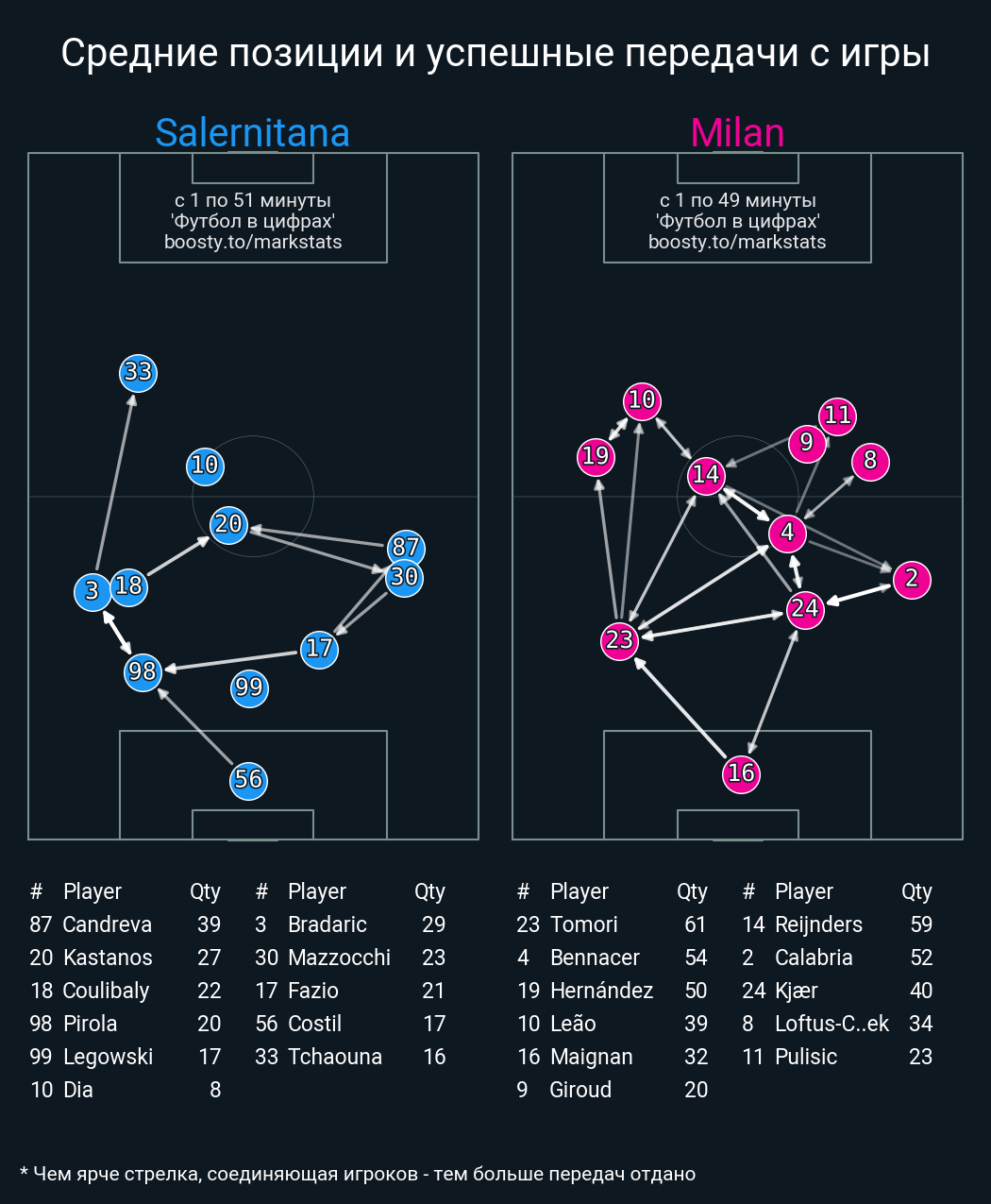 53 успешных передач из 65 попыток (4 под удар, 7 с продвижением, 13 на трети соперника)