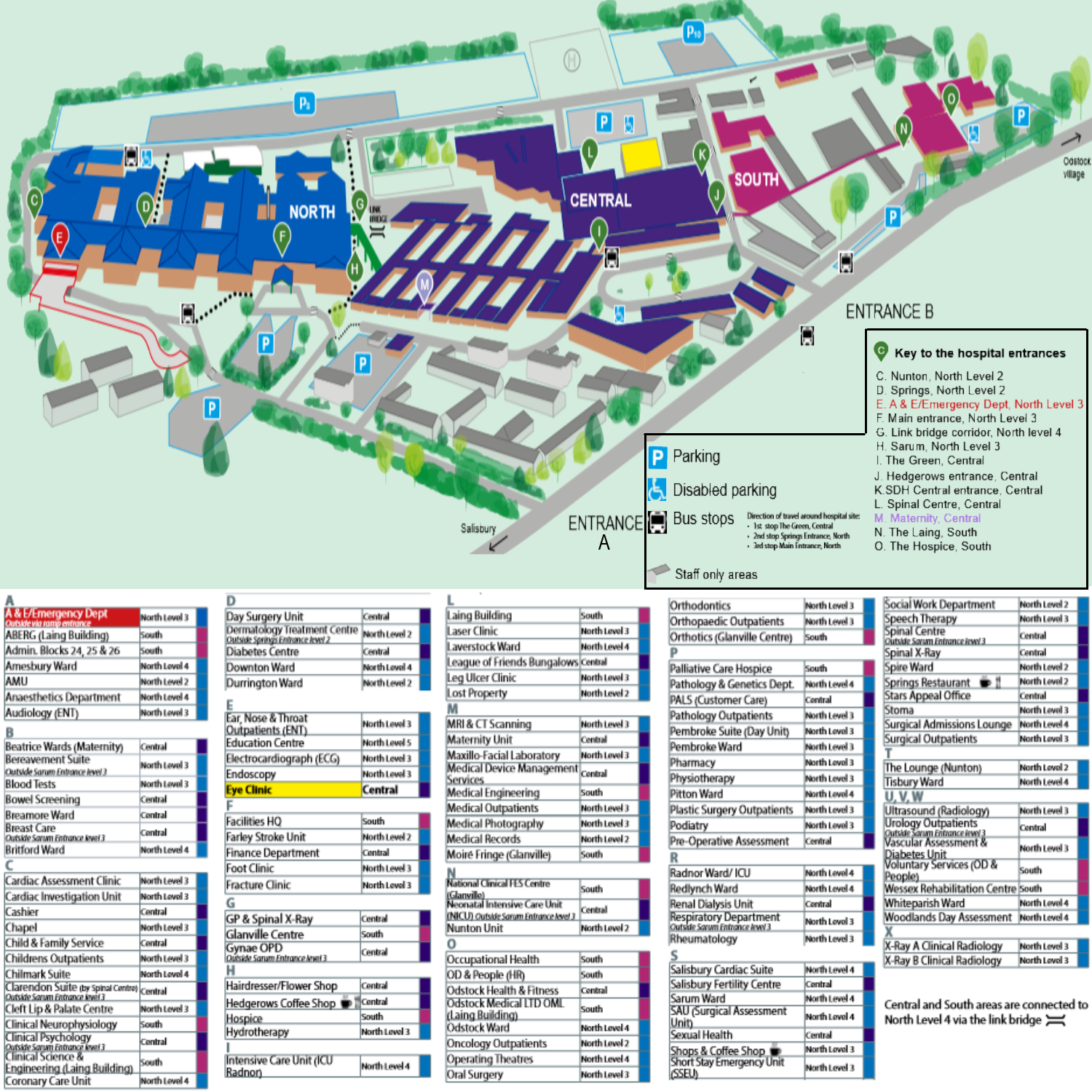 throughout the hospital . the map are displayed is divided into three Salisbury District Hospital Level 2 Nunton Entrance Medical Engineering Wessex Rehabilitati on Centre Tissue Via bility/Wound Research Group Occupational Health Traini ng Room National Clinical FES Centre Odstock Medical LTD (OML) Pallia tive Care Hospice Personnel Department
