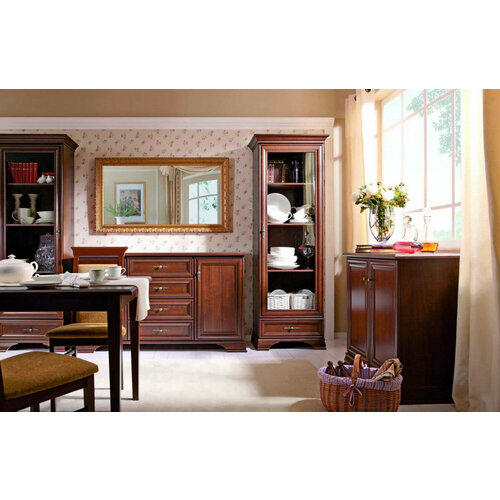 Composition de l'ensemble : Meuble Kentaki S320-KOM2D châtaignier, Meuble avec vitrine Kentaki S320-REG1W1S châtaignier, Meuble Kentaki S320-KOM2D4S châtaignier ; Largeur : 390 cm, Hauteur : 198 cm, Profondeur : 45 cm