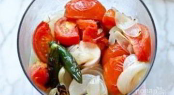 Помидоры — 3 шт ., лук репчатый — 1 шт ., перец чили — 1 шт ., чеснок — 3 зубч ., тмин — 1 чайн . л ., соль — по вкусу, лимонный сок — 1 стол . л ., подсолнечное масло — 40 гр, кинза, кориандр — 0 .5 пуч . Шаг 1: Подготовьте продукты по списку .