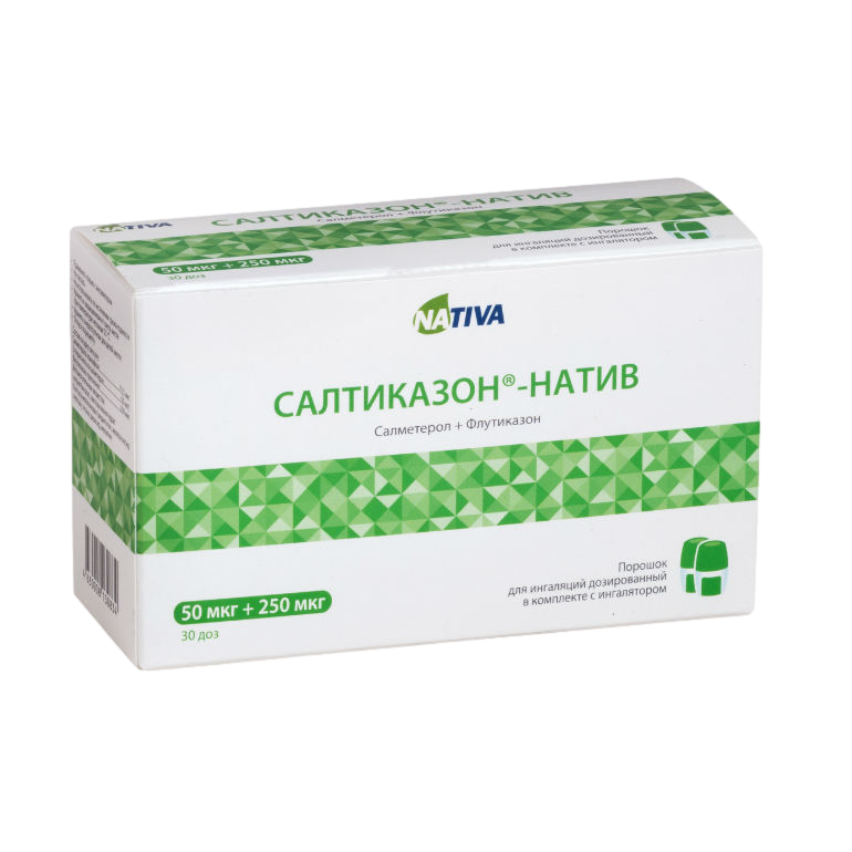 Цена на Салтиказон-натив в аптеках . Цена на Салтиказон-натив, порошок для ингаляций дозированный, за упаковку 60 капсул: дозировка 50 мкг + 100 мкг: 450-750 руб .; дозировка 50 мкг + 250 мкг: 550-970 руб .;