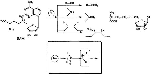 SAM (рис . 1), впервые описанный G .L . Cantoni (1952), представляет собой природное вещество, синтезируемое в печени из L-метионина и аденозинтрифосфорной кислоты (АТФ) с помощью фермента метионинаденозилтрансферазы (EC 2 .5 .1 .6 .), широко распространенное во всех биологических системах организма и вовлеченное в разнообразные метаболические процессы .