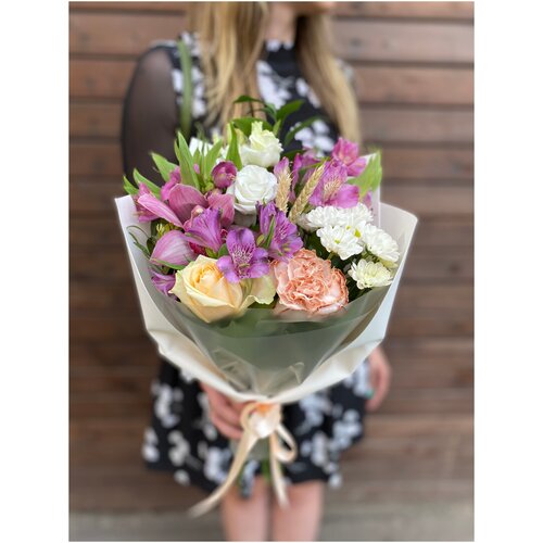 Orkide ve şakayık gülü, kabarık pamuk ve sıra dışı bir danthus içeren bir kompozisyon eklendi. Şık bir ambalajla süsledik ve öğretmen için derli toplu ve pratik (sonuçta ambalajı su geçirmez) bir buket oldu. Temalı bir süs ve kart ekleyebilirsiniz.