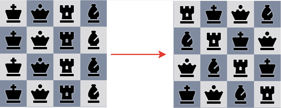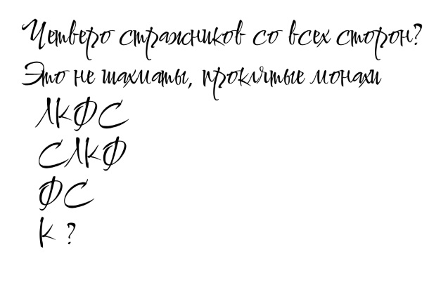 В саду виднелось странное шахматное поле 4х4 заполненное 4мя видами фигур одного цвета по 4 штуки каждой: Король, Ферзь, Ладья, Слон. К счастью, ранее мы обнаружили записку, которую мы довольно быстро сопоставили с этой загадкой и смогли выставить их на поле в нужном порядке, чем открыли проход внутри сада с длинным коридором.