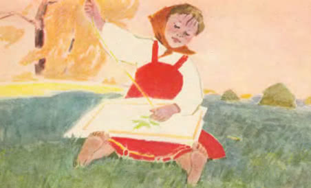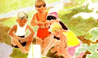 Раскрыла книжку с картинками . Брат и сестра сидят не шелохнувшись, глядят то на картинки, то на мамино лицо и, зажав коленями ладошки, поеживаются, когда мама читает что-то страшное, или весело хохочут - когда смешное .