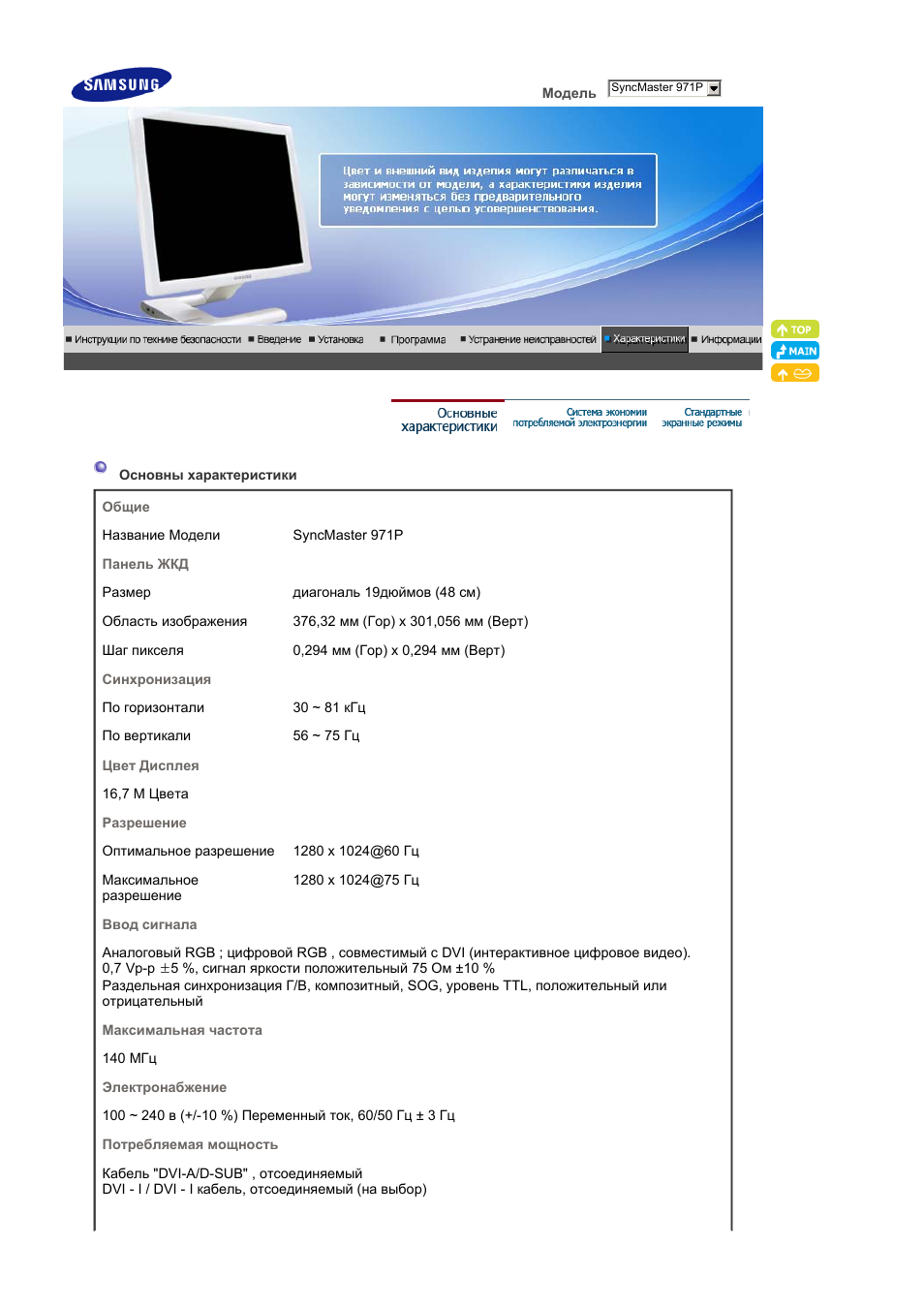 Samsung SyncMaster 971P - Основные технические . . .