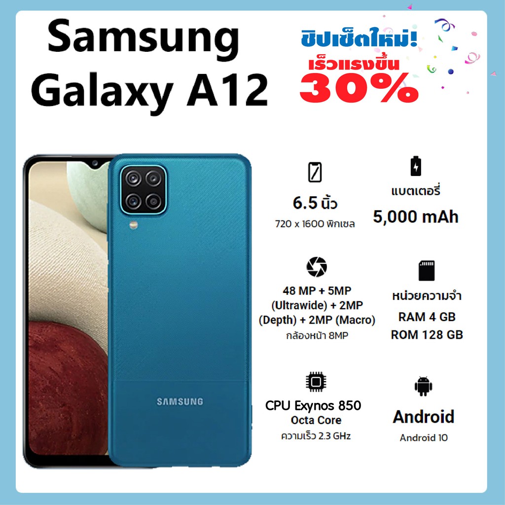 Samsung Galaxy A12 Exynos 850 mobile device price, specs and features a 6 .5 inches display and runs on Android 11 OS . The device is powered by Octa-core (4x2 .0 GHz Cortex-A55 & 4x2 .0 GHz Cortex-A55) processor paired with 4GB RAM, battery is Non-removable Li-Po, 5000 mAh . On board storage is at 32/64/128GB Built-in and option to expand the memory microSD, up to 256GB (dedicated slot) .