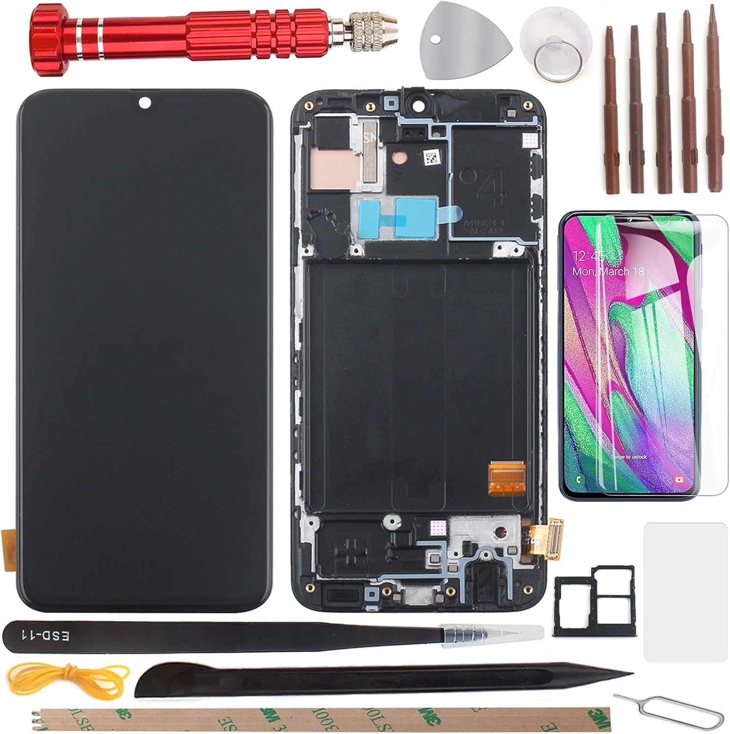 LCD displej, dotykové sklo a rám pro Samsung Galaxy A40 A405F . Pokud máte poškozený LCD displej nebo dotykové sklo na vašem Samsung Galaxy A40 A405F , toto je díl, který potřebujete, aby vaše zařízení bylo opět plně funkční . Tento LCD komplet pro Samsung Galaxy A40 A405F obsahuje: