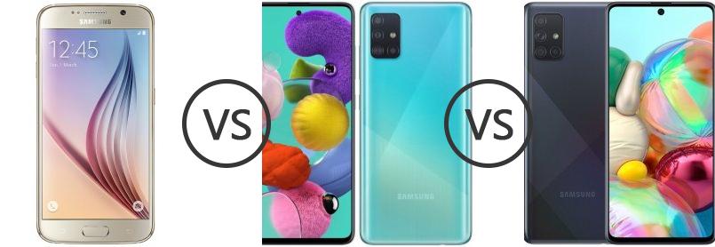 VS . Samsung Galaxy A71 . Samsung Galaxy A51 . Here we compared two mid-range smartphones: the 6 .7-inch Samsung Galaxy A71 (with Qualcomm Snapdragon 730) that was released on December 12, 2019, against the Samsung Galaxy A51 , which is powered by Exynos 9 Octa 9611 .