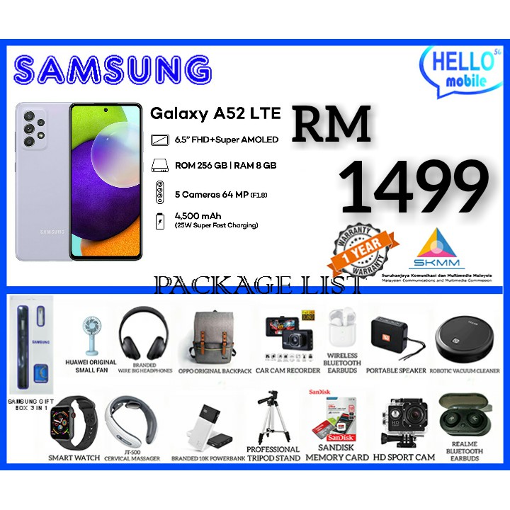 Samsung Galaxy A52 5G (8+256GB) 香港行貨:$3510 . +$99換小米10000mAh 防爆*雙USB頭*充電寶一個 . +$78換Super藍牙耳機一個 . 地址:深水埗,深之都2樓76-79號鋪 . (深水埗D2出口,馬會側邊)