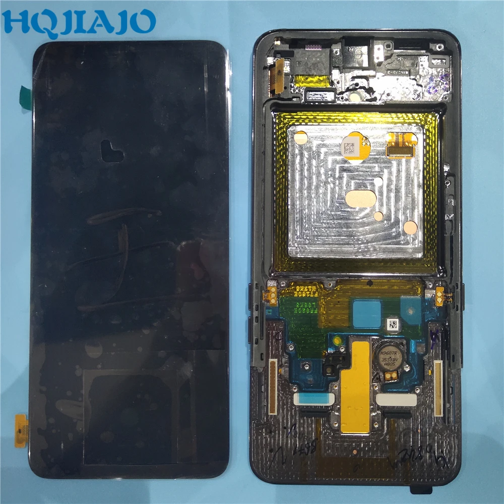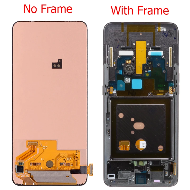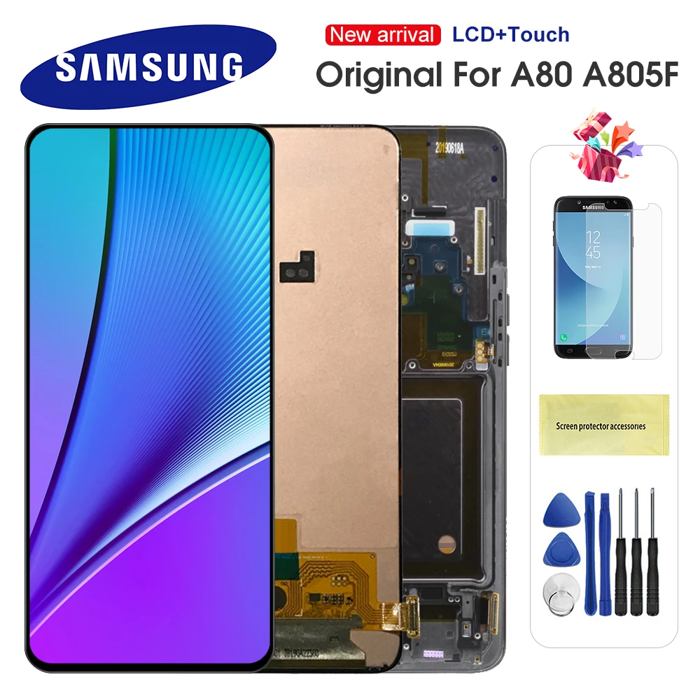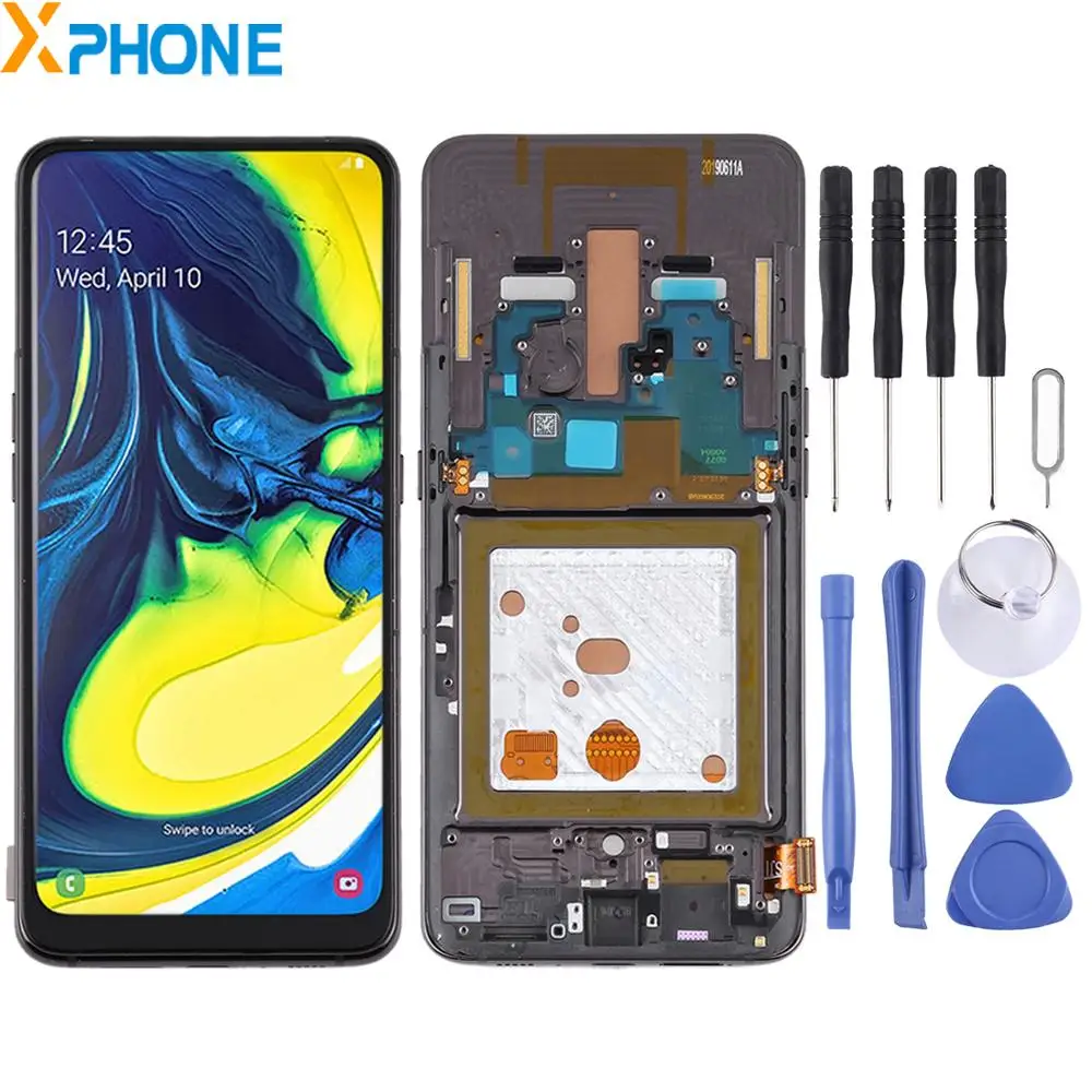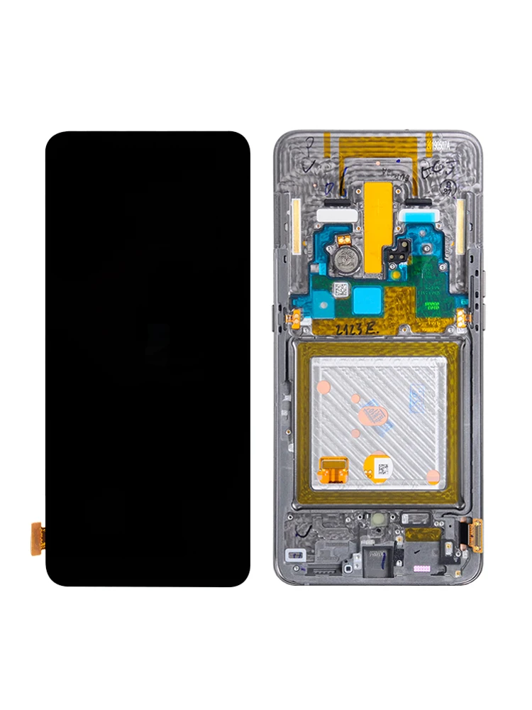 Оригинален Super AMOLED дисплей за Samsung Galaxy A80 A805 с capacitive touchscreen . Дисплея е комплект с тъчскрийна, и тънката метална рамката отстрани заедно с копчетата .