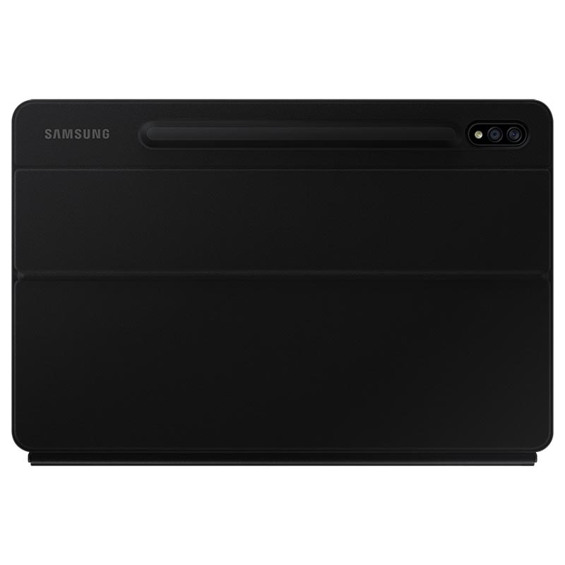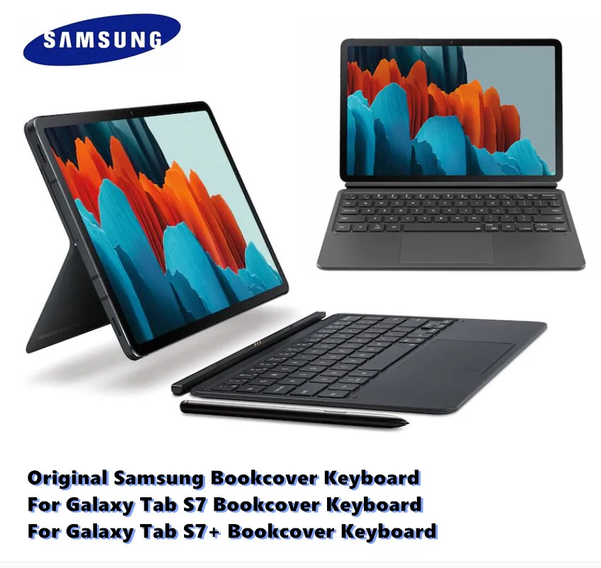 The Samsung Book Cover Keyboard uses a two-piece design - a front keyboard cover , and a back cover that doubles as a kickstand . It transforms your Galaxy Tab S7 or Tab S7+ tablet into a virtual laptop, thanks to its integrated keyboard and touchpad . The kickstand with its "free stop hinge" lets you freely adjust the angle of the tablet . . .
