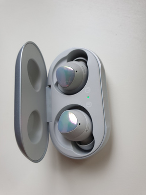 Samsung Galaxy Buds White . В феврале 2019 года южнокорейская корпорация презентовала общественности беспроводные наушники c мощным аккумулятором и сенсорным управлением .