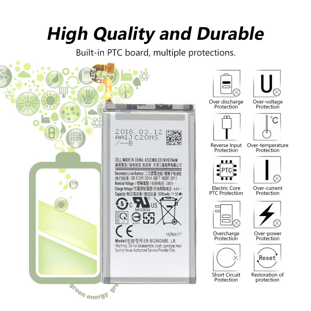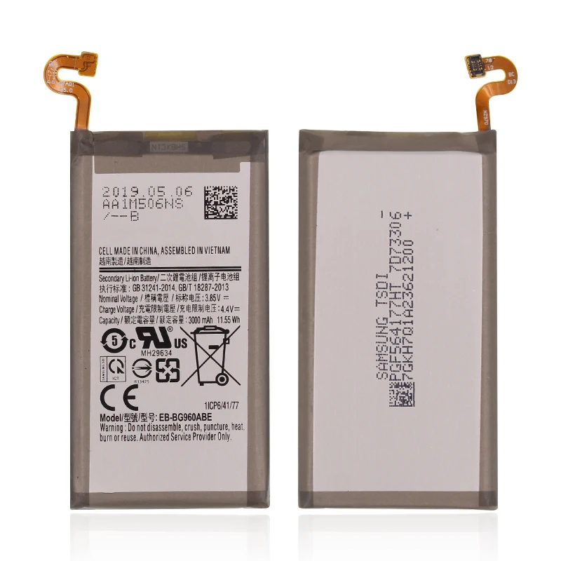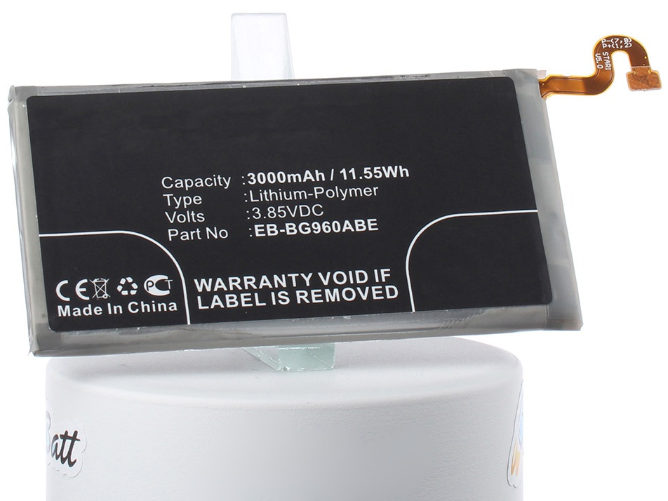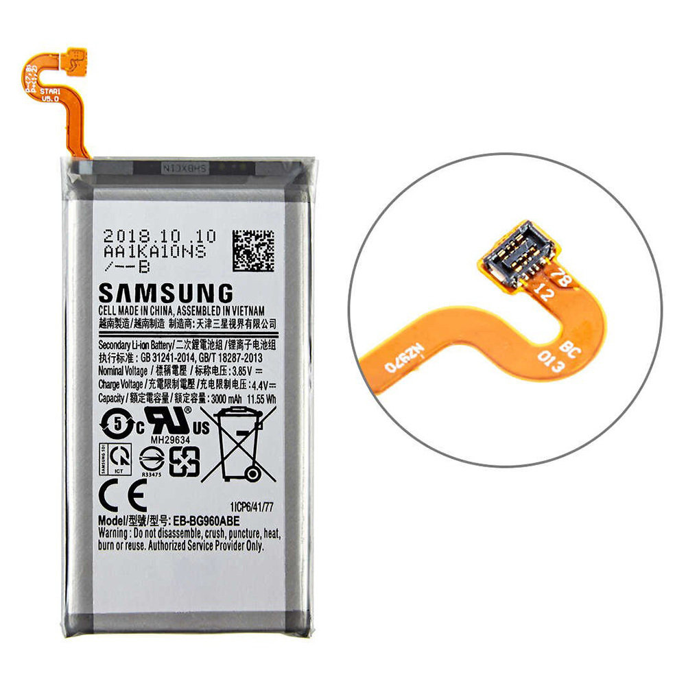 Baterie SAMSUNG EB-BG960ABE . Originální náhradní baterie SAMSUNG ( EB-BG960ABE ) typu Li-Ion o kapacitě 3000 mAh určená pro mobilní telefony Samsung G960F Galaxy S9 . Vlastnosti baterií Li-ion: Nemá paměťový efekt, podléhá minimálnímu samovybíjení; Chod baterie hlídá vestavěná elektronika