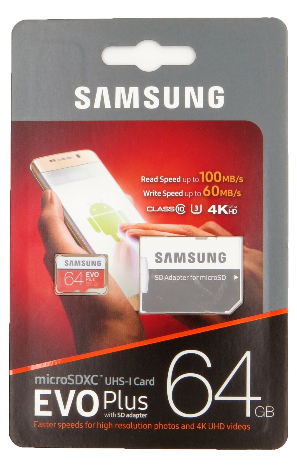 Item 1 of 2 . Samsung micro SDXC 64GB EVO Plus + SD adaptér (MB-MC64HA/EU) 98% . 58 hodnocení . Paměťová karta microSDXC EVO Plus s kapacitou 64 GB pro vaše mobilní zařízení . Díky vysoké rychlosti čtení až 100 MB/s a zápisu až 20 MB/s hravě zvládá i přenos a přehrávání videí v rozlišení 4K UHD . Součástí balení je SD . . .