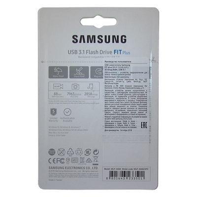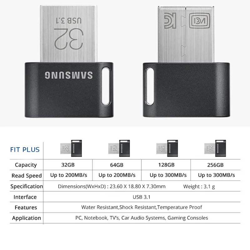 Description . Streamline data transfer with this Samsung FIT Plus flash drive . The USB 3 .1 interface supports transfer speeds of up to 200MB/sec . so you can save and access files quickly, and the 32GB capacity offers sufficient space for all types of media . This water-resistant Samsung FIT Plus flash drive is suitable for travel .