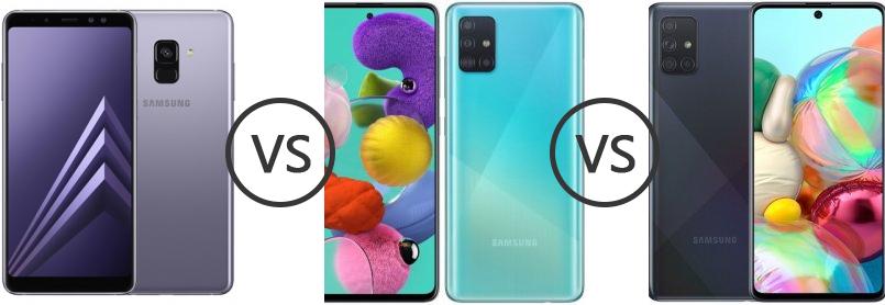 VS . Samsung Galaxy A71 . Samsung Galaxy A51 . Here we compared two mid-range smartphones: the 6 .7-inch Samsung Galaxy A71 (with Qualcomm Snapdragon 730) that was released on December 12, 2019, against the Samsung Galaxy A51 , which is powered by Exynos 9 Octa 9611 .