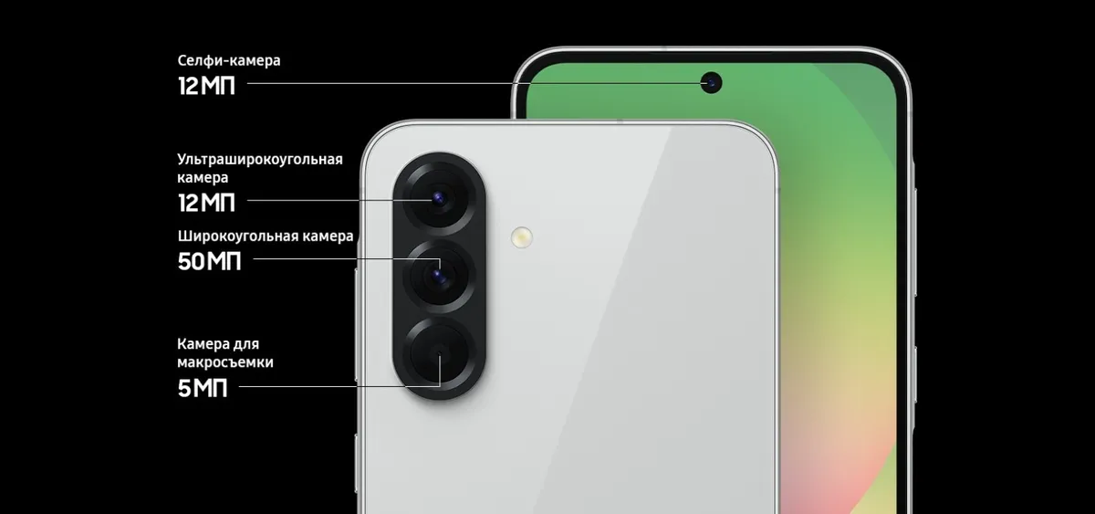 Благодаря уменьшению толщины до 7,4 мм, смартфон Galaxy A56 5G очень эргономичен и легко помещается в руке или кармане. Камеры расположены в новом линейном формате, что придаёт вашему смартфону неповторимый стильный облик. Galaxy A56 5G представлен в актуальных цветах: черный, серый, зеленый и розовый.
