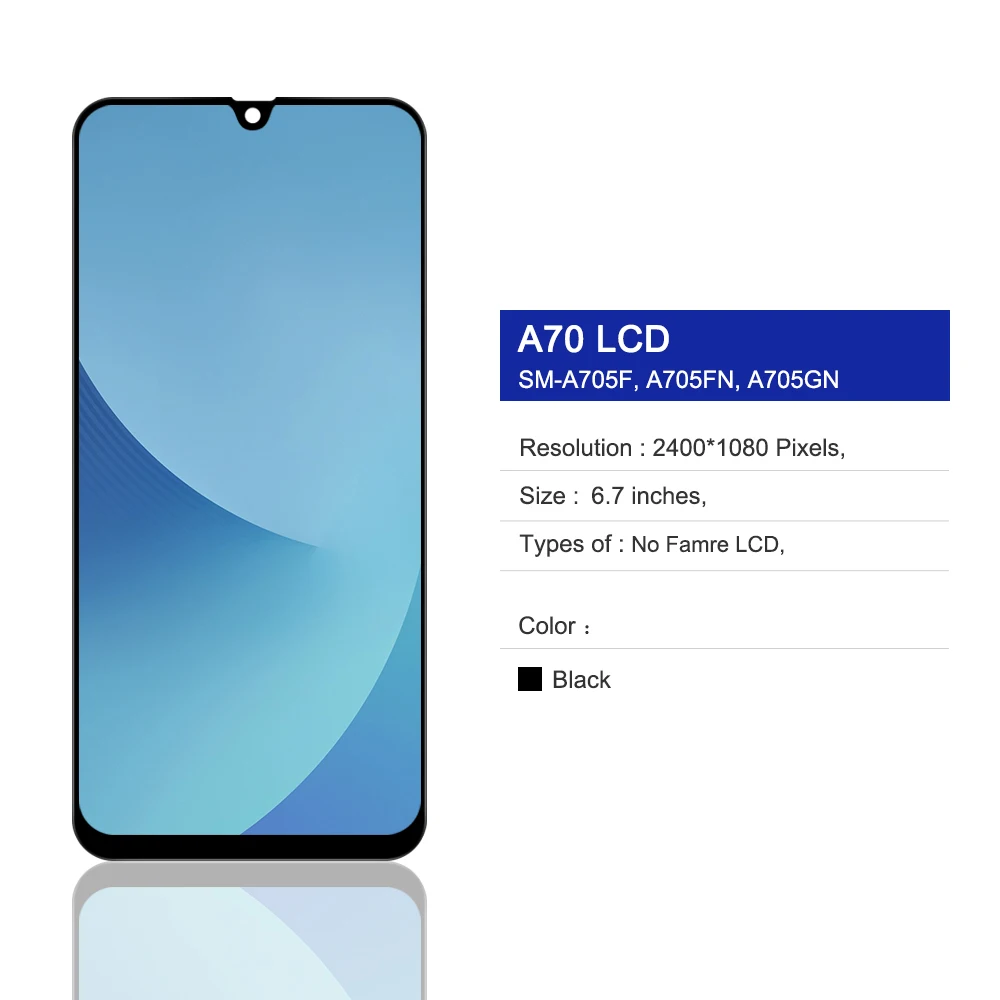 Вот главные характеристики и технические параметры Samsung Galaxy A70 : Экран: 6 .7" Amoled; Разрешение: 1080 x 2400 px · FHD+; RAM: 6GB - 8GB; Хранение: 128GB; Процессора: Qualcomm Snapdragon 675