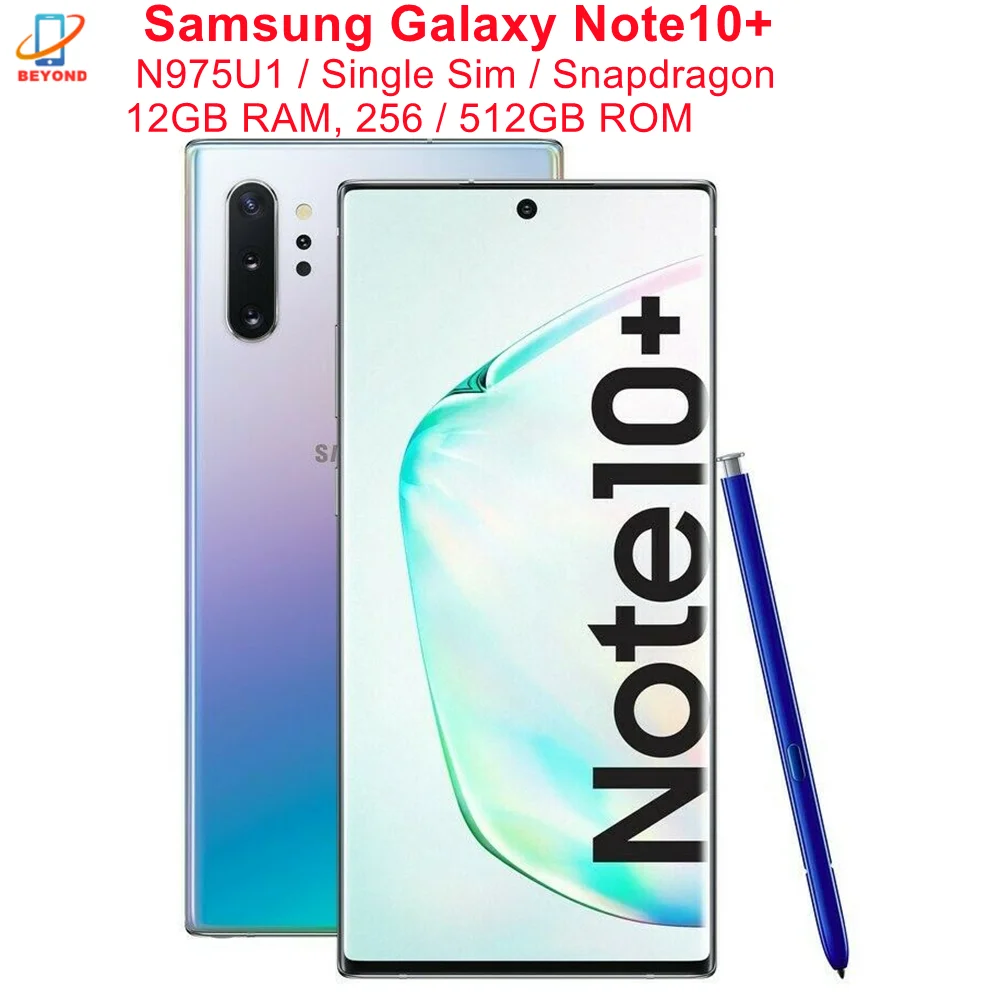 The Samsung Galaxy Note10+ US Unlocked (SM- N975U1 ) is an Android Smartphone . It has 6 .8 inches, Quad HD+ 3040 x 1440 Pixels screen resolution . And it is powered by Qualcomm Snapdragon 855 CPU, and Adreno 640 GPU . It runs Android 9 .0 Pie . This Samsung smartphone gives the user 12GB of RAM .