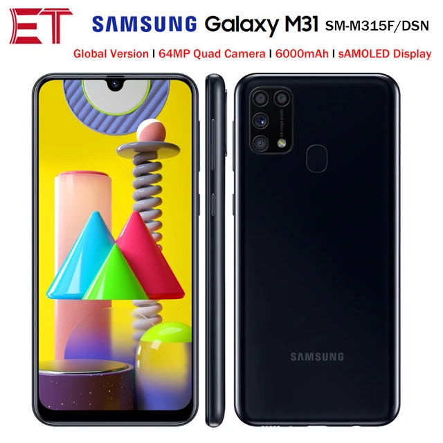 Samsung galaxy m31 sm m315f dsn Android smartphone . Announced 2020, February . Features 6 .4" SUPER AMOLED display . Exynos 9611 (10nm) chipset, 6000 mAh battery, 64, 128 GB storage, 6 GB RAM