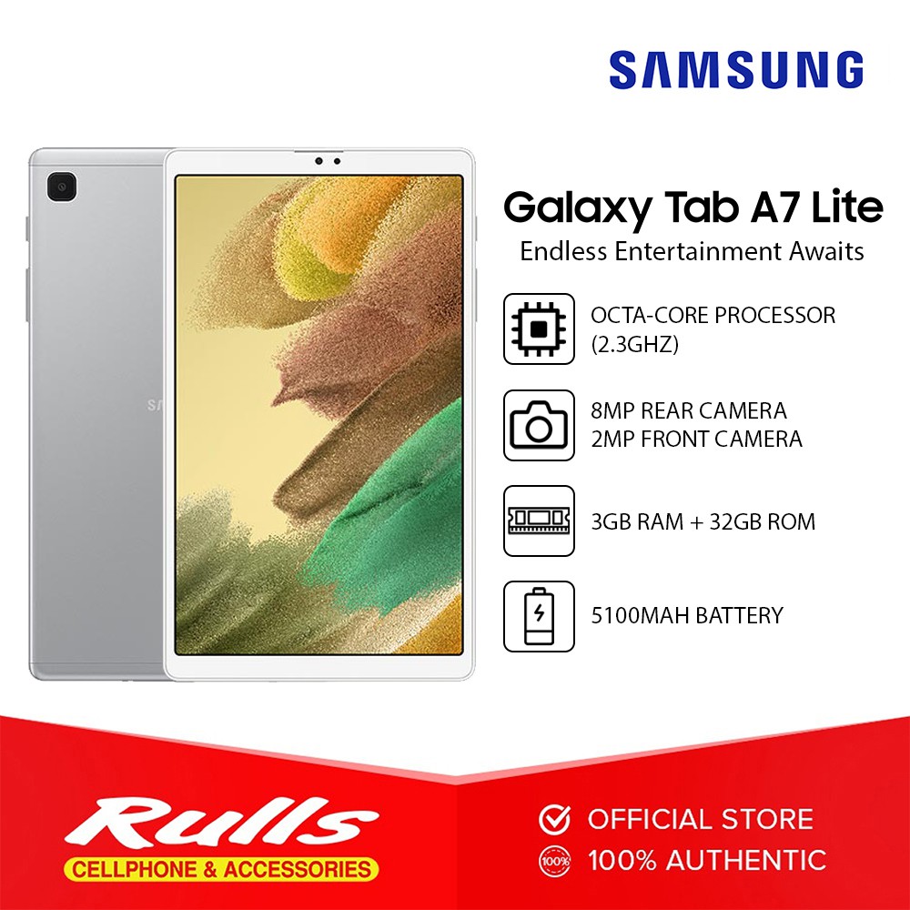 Samsung Galaxy Tab A7 Lite ; Display: 8 .7-inch * 1340x800 (WXGA+) TFT * Measured diagonally as a full rectangle without accounting for the rounded corners . Actual viewable area is less due to the rounded corners . OS: Android 11: Dimension: 212 .5 x 124 .7 x 8 .0mm: Weight: Wi-Fi: 366g LTE: 371g: Camera [Rear] 8MP AF [Front] 2MP: Memory * 3GB RAM with 32GB internal storage/
