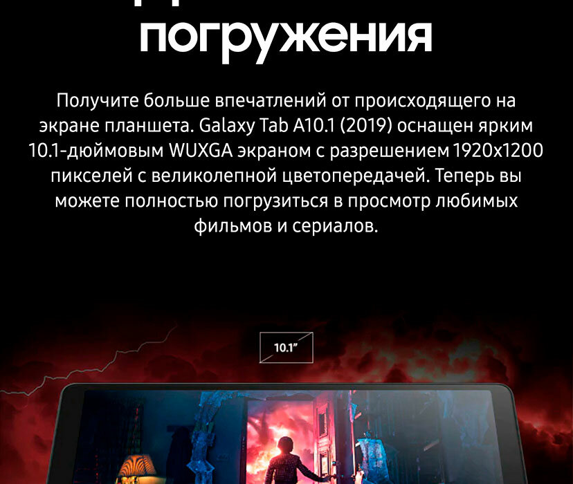 Galaxy Tab A10 .1 (2019) оснащён ярким 10 .1-дюймовым WUXGA экраном с разрешением 1920х1200 пикселей с великолепной цветопередачей . Теперь вы можете полностью погрузиться в просмотр любимых фильмов и сериалов .