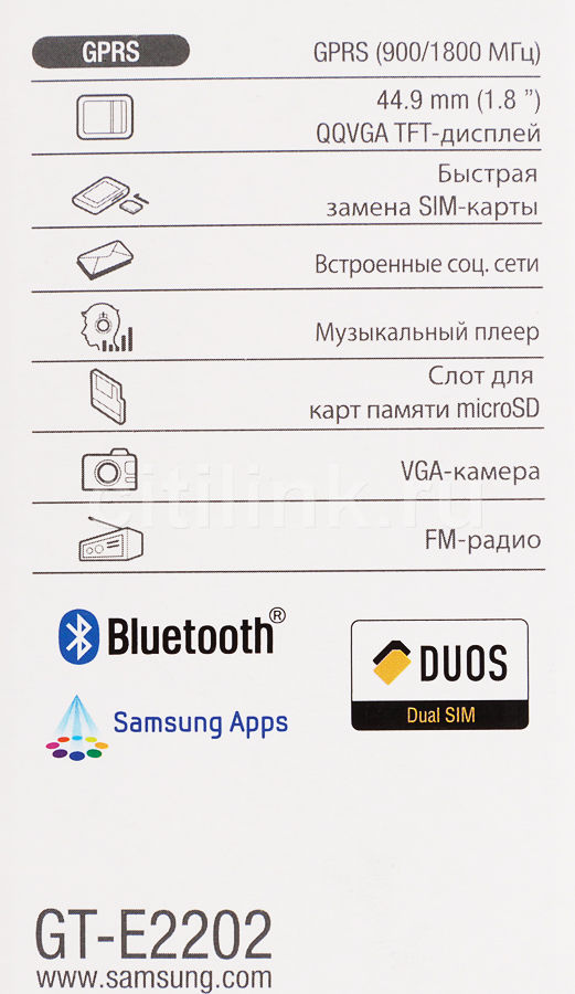 Samsung GT-E2202 Duos от 3 699 р . не сенсорный, 1 .8 ", проприетарная, зарядка: 1000 мАч, 130 г . . .