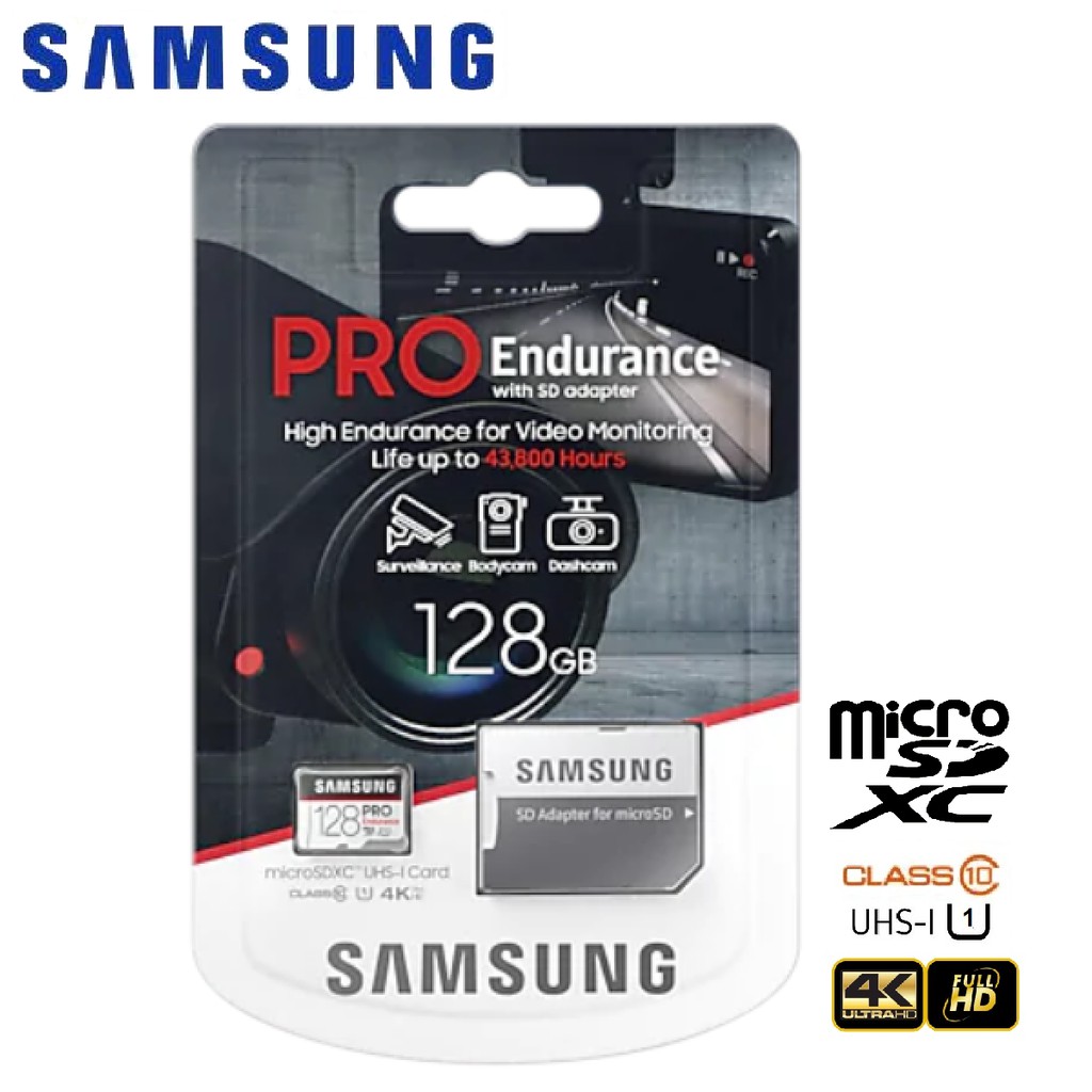 The 128GB capacity accommodates hours of Full HD footage, while the endurance rating of up to 43,800 hours makes it ideal for dash cams and security cameras . This Samsung PRO Endurance microSDXC memory card features read speeds of up to 100MB/sec . for rapid file sharing . Built to last, Samsung's PRO Plus offers extreme performance in a variety . . .