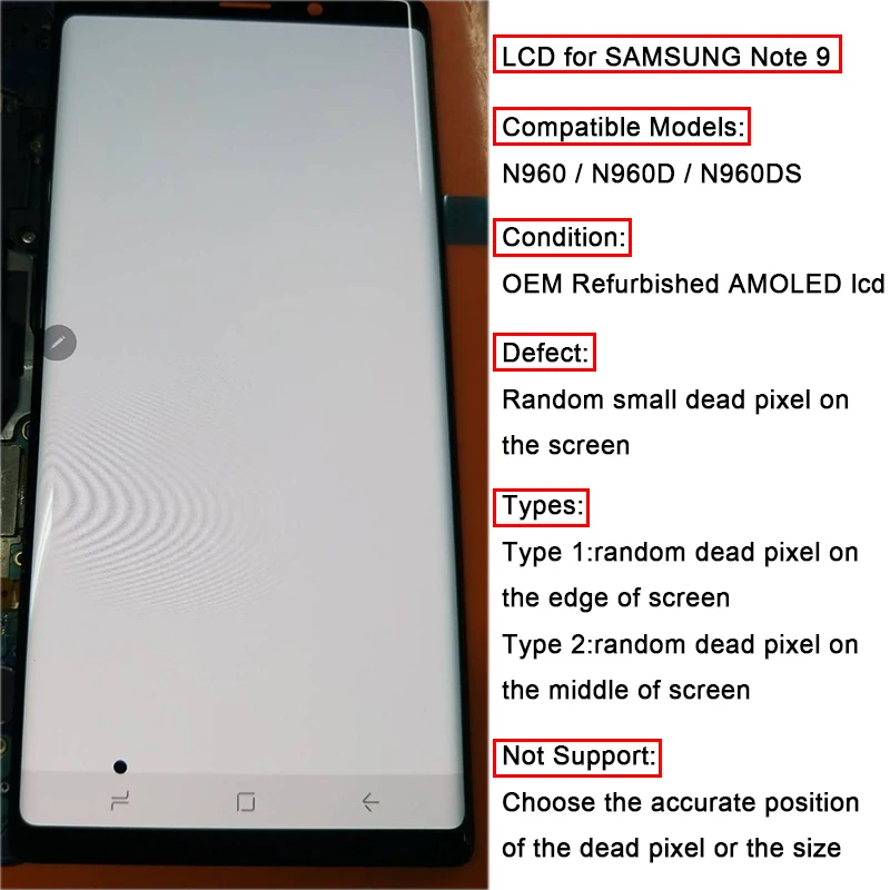 Описание . Оригинален Super AMOLED дисплей за Samsung Galaxy Note 9 с capacitive touchscreen . Дисплея е комплект с тъчскрийна, и тънката метална рамката отстрани заедно с копчетата . За да смените този модул дисплей за Galaxy Note 9 , трябва да се обърнете към специализиран сервиз .