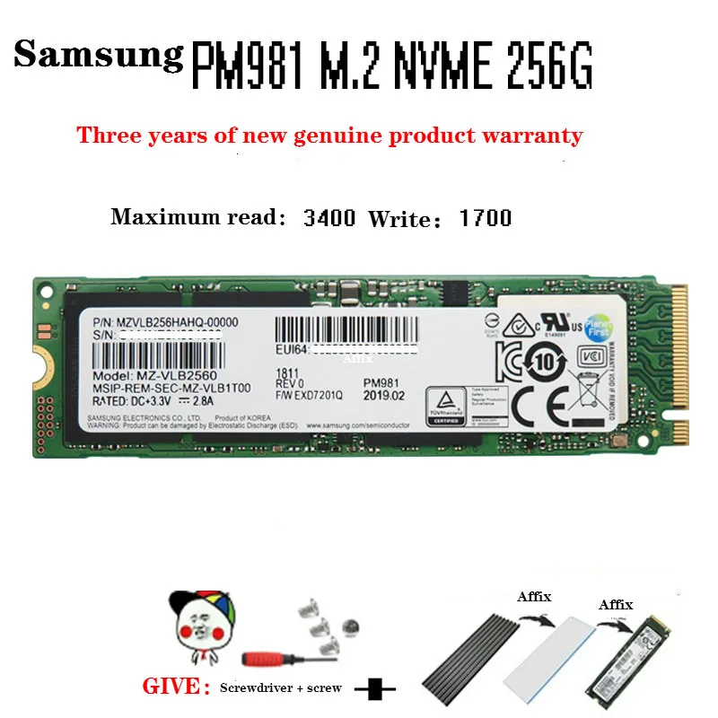 512GB Samsung PM981 , M .2 (2280) PCIe 3 .0 (x4) NVMe SSD, Polaris V2, TLC V-NAND, 3000MB/s Read, 1800MB/s Write, 270k/420k . Contenuto della confezione 1 x MZVLB512HAJQ-00000