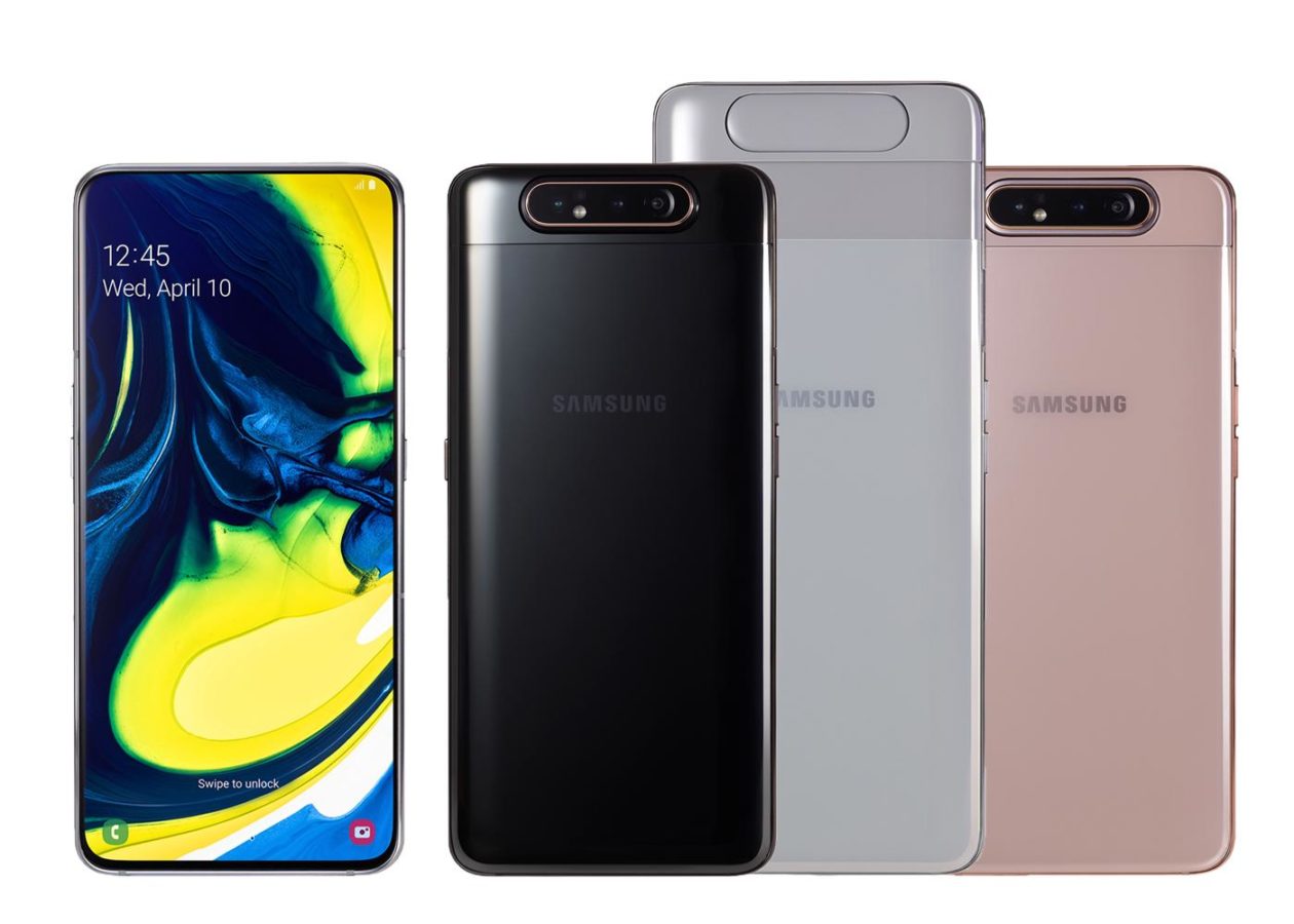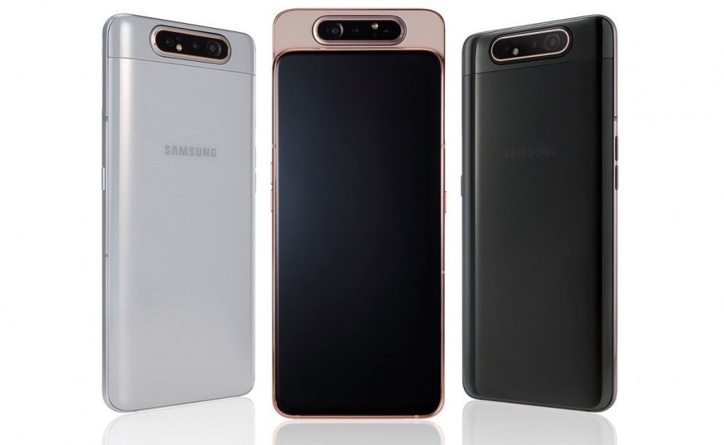 1 . Samsung Galaxy A80 . Начнём с очень любопытного смартфона от южнокорейской компании Samsung . Особенно выделяется в данном смартфоне камера - выдвижная и поворотная одновременно .
